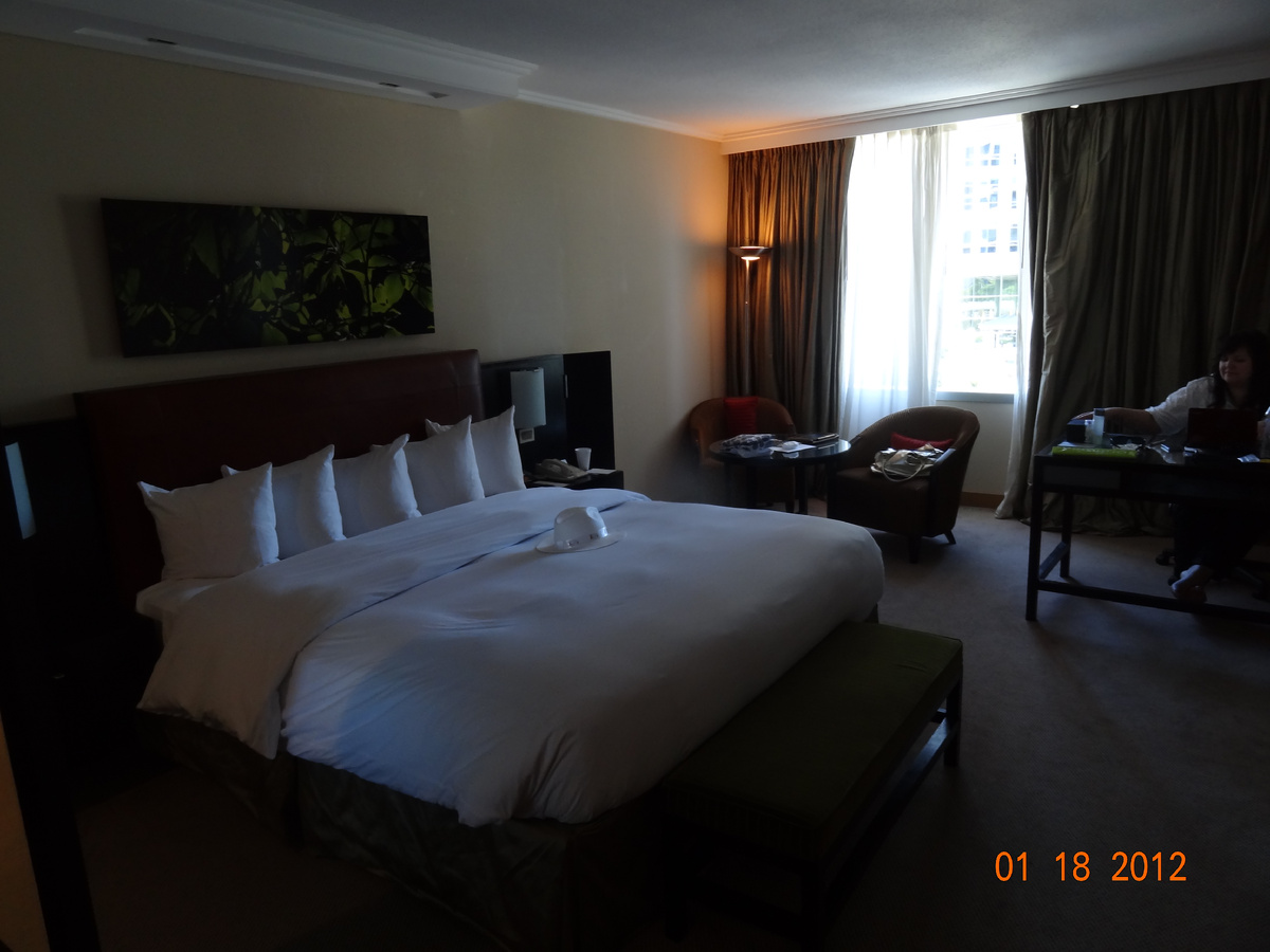 плотные шторы на окнах от яркого солнца, белоснежное белье на постели, рабочая зона и зона отдыха с креслами. телевизор и гардеробная с ванной комнатой тоже присутствуют. вот вид номера от окна