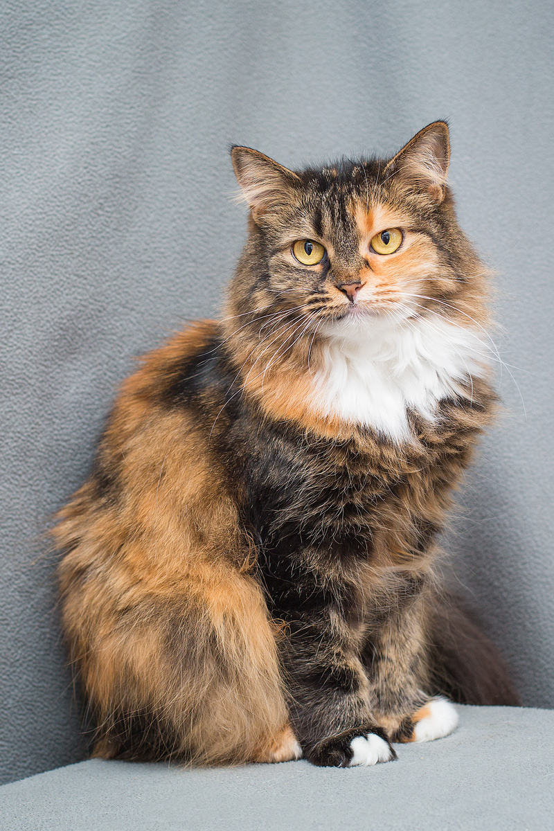 Есть в Просто Мусе кошечка невиданной красоты. Куколка Северодонецкая. Кроткая, нежная, чисто весенняя фиалка. Бог наделил зверя шикарной пушистой шубкой, длинными усами, великолепным хвостом, что жар-птица нервно курит от зависти. Сотворив совершенство, писатель сверху решил он достаточно поработал, мол, судьба и так выведет куда полагается, поведет по верной дорожке. Но что-то внезапно сломалось в жизненном паззле. Пошло не по задуманному. Нашли девочку в конце военных действий в Северодонецке близ больницы. Она неподвижно сидела в мокрой траве, никуда не торопясь. Собственно, спешить кошке было некуда. Большинство домов в том районе разрушены. Куколка не сопротивлялась, когда Анжела посадила ее в переноску. Так и откуда взяться силам, вес ребенка еле дотягивал до двух килограмм. Сильное истощение, сколько времени в желудке не было еды никто не знает. Первые недели Куколка никак не могла наесться, жадно уничтожая влажные пакетики, хрумкая сухим кормом. В декабре 2023 года привез