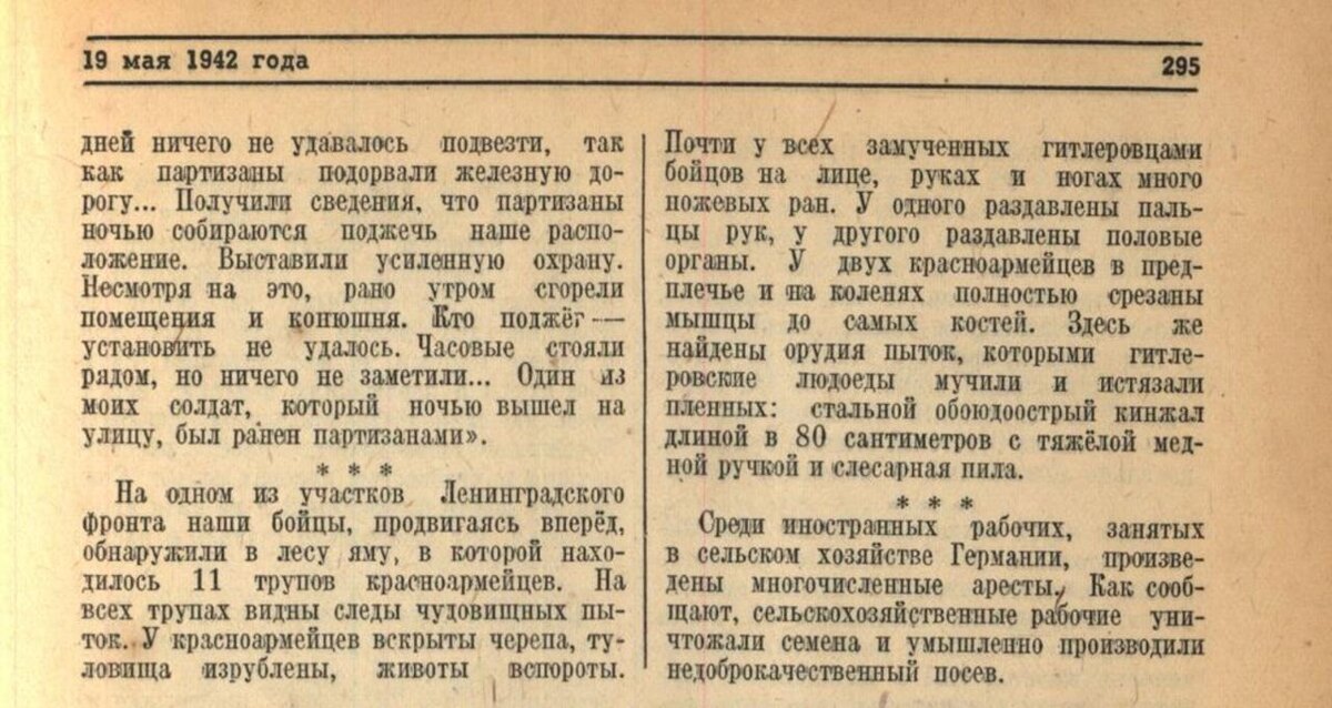 Совинформбюро с первых месяцев Великой Отечественной войны документировало зверства нацистов на оккупированных территориях. Это были сводки с мест массовых казней, пыточных подвалов, сожжённых деревень. 19 мая 1942 года — на одном из участков Ленинградского фронта наши бойцы обнаружили в лесу яму с телами 11 красноармейцев: "На всех трупах — следы чудовищных пыток. Вскрытые черепа, изрубленные туловища, вспороты животы. У одного бойца — раздавлены пальцы рук, у другого — половые органы. У двоих — мышцы в предплечьях и на коленях срезаны до кости. Почти у всех — множественные ножевые раны на лице, руках и ногах. Рядом найдены орудия пыток: обоюдоострый кинжал длиной 80 сантиметров с тяжёлой медной рукояткой и слесарная пила". 19 мая 1944 года — жители города Даугавпилс (Латвийская ССР), сбежавшие из немецкой тюрьмы, передали следующее: "После захвата города немцы разграбили магазины и квартиры. Начались массовые аресты и расстрелы мирных граждан. Убивали за участие в профсоюзах, за ра