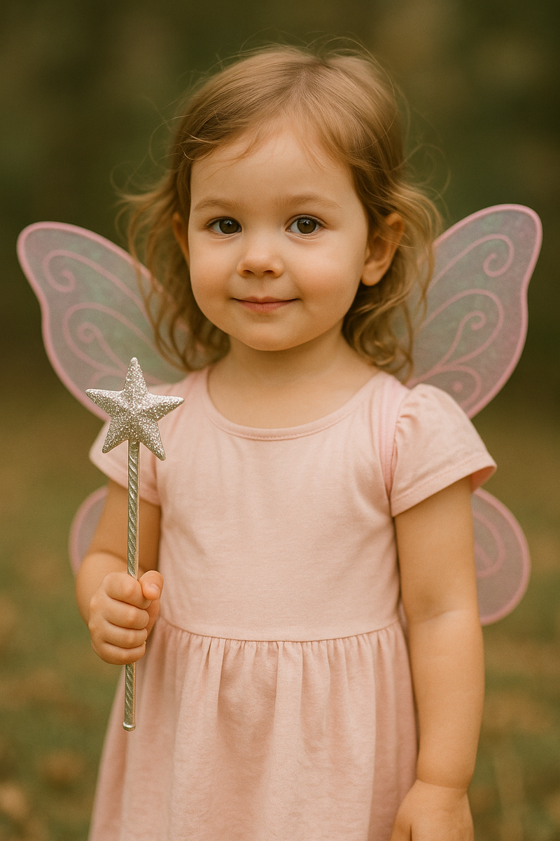 — Да. Блестящая. И работает — если верить. А она верит. Каждый вечер превращает папу в дракона и маму в принцессу. И всё — по расписанию. 📸 На фото — малышка в розовом платье с прозрачными крылышками за спиной и серебряной палочкой-звёздочкой в руке. Её взгляд — тихий, уверенный, немного таинственный. Как будто она уже знает, что у тебя за спиной, и точно решит — превращать тебя в кота или нет. Вокруг осень, но рядом с ней всё будто весна. 🎨 На картине: