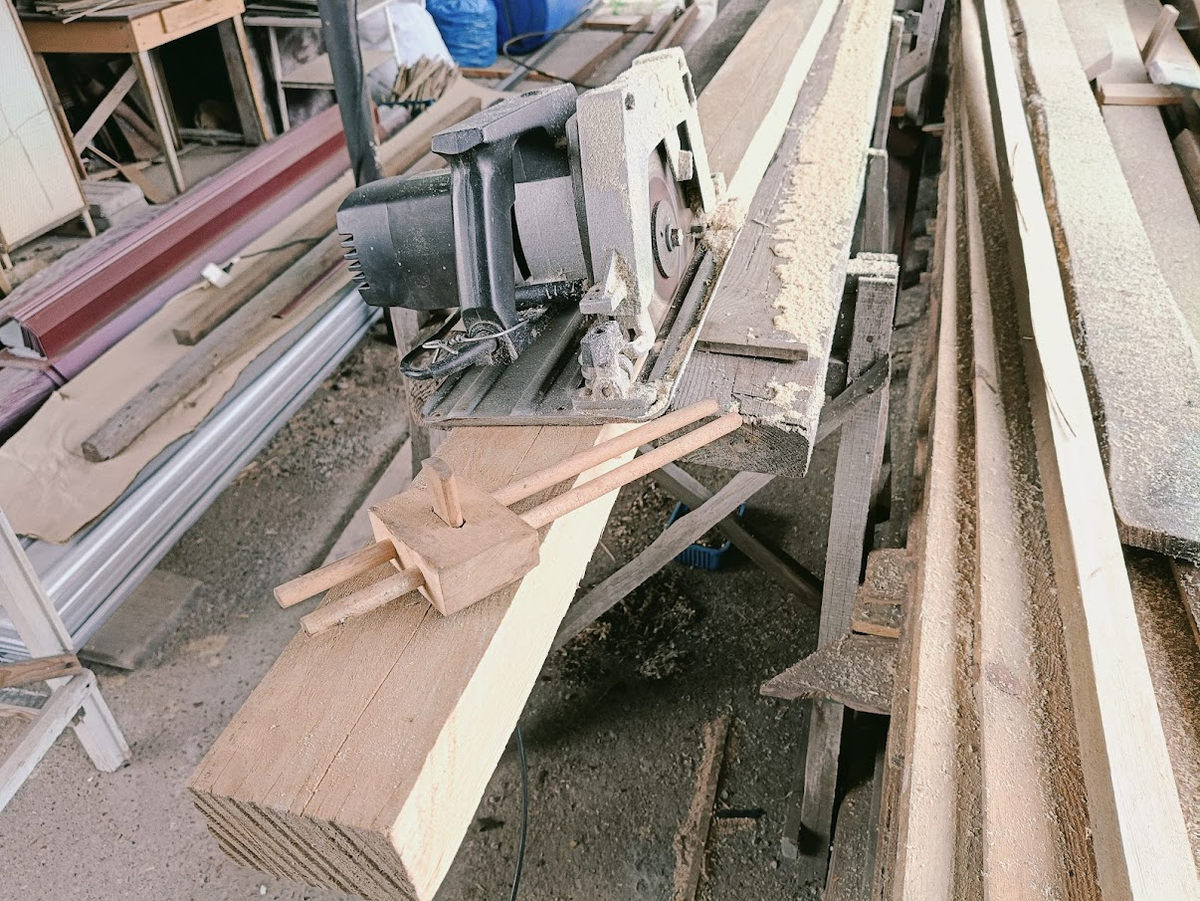 В закромах обнаружил настоящий раритетный инструмент в отличном состоянии, изготовленный, думаю, годах в 70-х прошлого века и по достоинству оценил работу с ним. Как раз необходимо было выполнить разметку вертолётной 6-метровой сосновой доски 150х50 для роспуска на 4 бруска. Требований к геометрии получаемых брусков особых не предъявляется, использоваться будут в некритичных к этому местах. Необходимо прочертить несколько параллельных линий вдоль грани доски. Нитью это выполнить эффективно не получится, так доска кривая в двух плоскостях, а нить даёт идеальную прямую. Бегать с линейкой и рулеткой 6 метров тоже затея так себе. Идеально для этой цели подошел старый советский рейсмус. С ним это было сделано за пару минут. Принцип работы рейсмуса прост - необходимо выдвинуть одну из штанг на необходимую длину и прижать клином. Далее - чертим канавку на заготовке, прижимая рейсмус к доске. Распускал циркулярной пилой без бокового упора (он отсутствует). Использоваться длинные и не очень ро