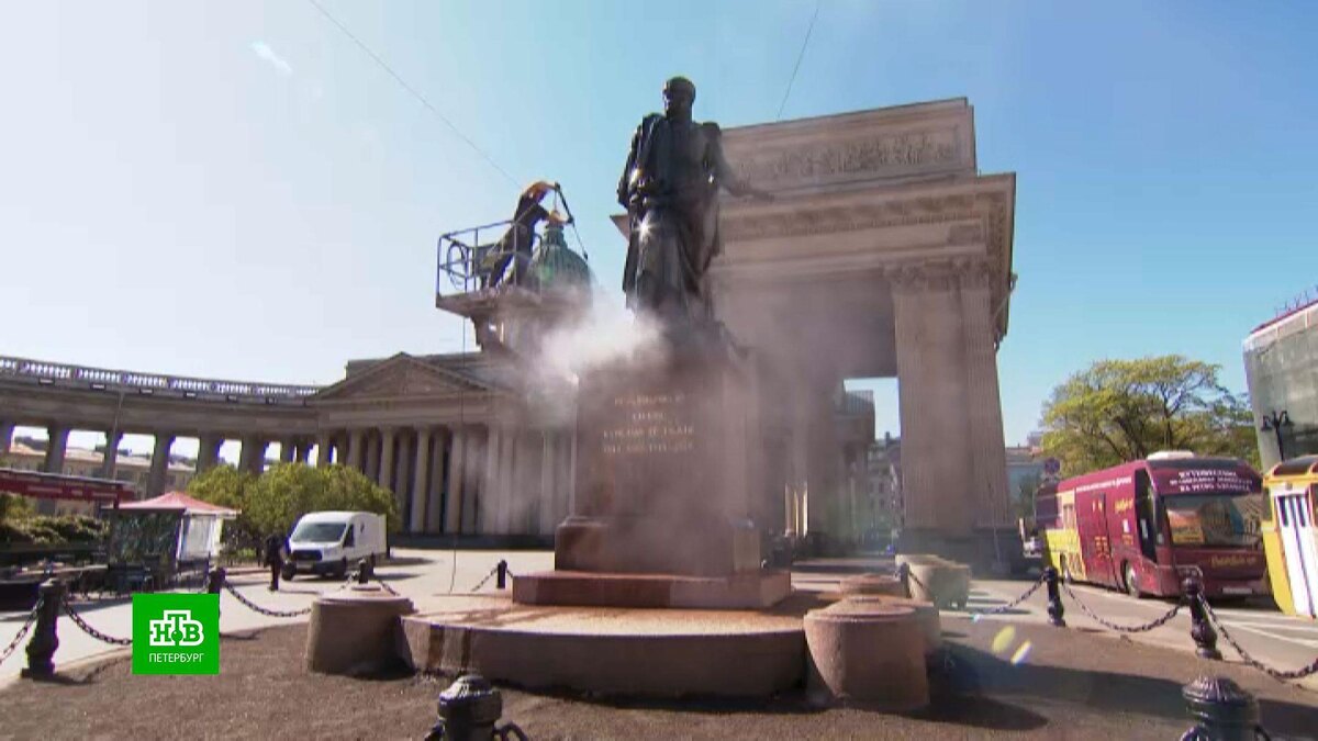 [ Смотреть видео на сайте НТВ ] В Петербурге стартовала ежегодная очистка памятников. Сегодня душ приняли монументы Барклаю де Толли и Михаилу Кутузову у Казанского собора. Бронзовые изваяния регулярно готовят ко Дню города. Этот процесс основательный и занимает от четырех до пяти часов. Памятники имеют выраженный рельеф и много труднодоступных мест. Павел Голубков, заведующий службой по текущему уходу и содержанию памятников Государственного музея городской скульптуры: «В процессе работ будут промыты сначала поверхности бронзовых скульптур с использованием пенного нейтрального моющего средства с последующим использованием установки высокого давления. И далее, когда памятники высохнут, будут непосредственно проведены работы по консервации поверхности бронзы с использованием синтетического воска». Перед началом очистки специалисты делают фотографии разных частей памятников, что позволяет оценить их состояние. Причем многие снимки делаются с высоты, ведь особо проблемные участки, на кото