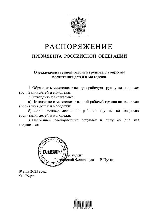 Владимир Путин распорядился создать межведомственную рабочую группу по вопросам воспитания детей и молодежи