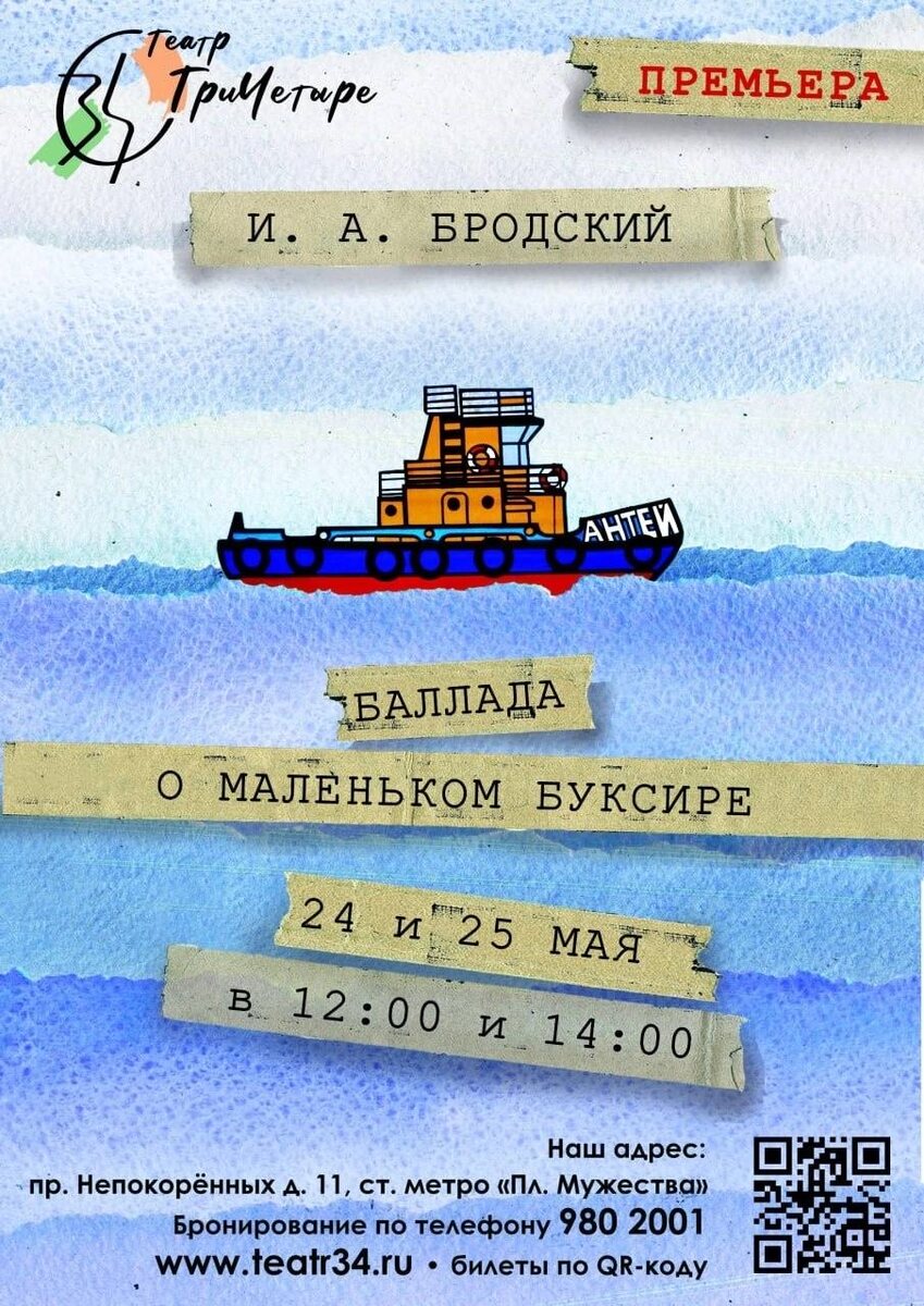 2️⃣4️⃣ и 2️⃣5️⃣ мая в 12:00 и 14:00 состоится долгожданная ⌨️⌨️⌨️⌨️⌨️⌨️⌨️⌨️. В день рождения Иосифа Бродского на сцене театра - "Баллада о маленьком буксире", мечтательная навигация под музыку композитора Aнтона Алексеевского. 🌊 Спектакль поставлен по одноимённому стихотворению Бродского, которое стало первым опубликованным на родине. Одно из немногих произведений поэта для детей - это размышление о своём месте в мире, о призвании, о любви к родному городу. Приходите!
