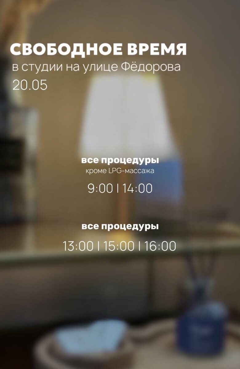 СВОБОДНОЕ ВРЕМЯ НА ФЁДОРОВА 20.05 • ONLINE запись • WHATSAPP Ждём вас к нам на процедуры 🤍