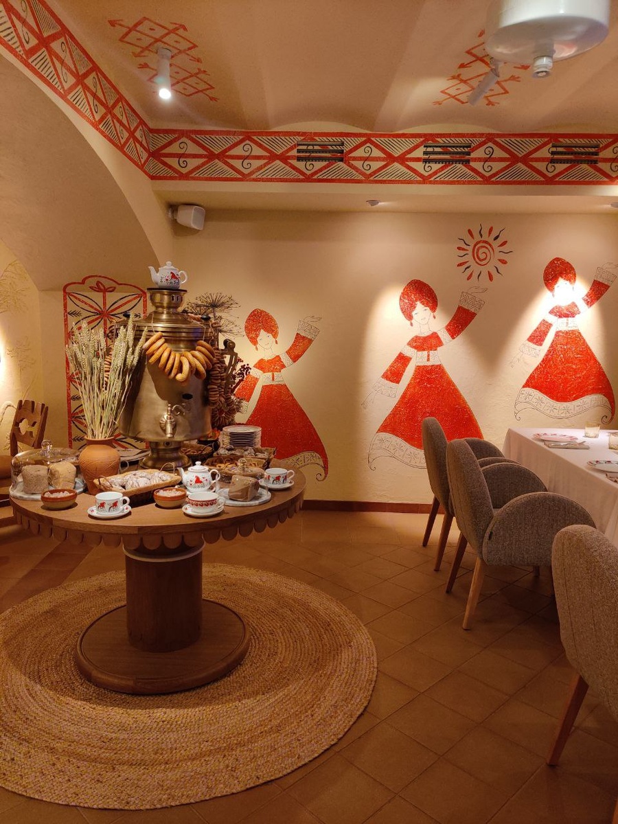 Интерьер в меру клюквенный, с мезенской росписью, фреской в "суровом стиле" (она обнаружилась во время ремонта), наличниками и самоварами на столах (самовары вполне действующие, чай из них исправно наливается).