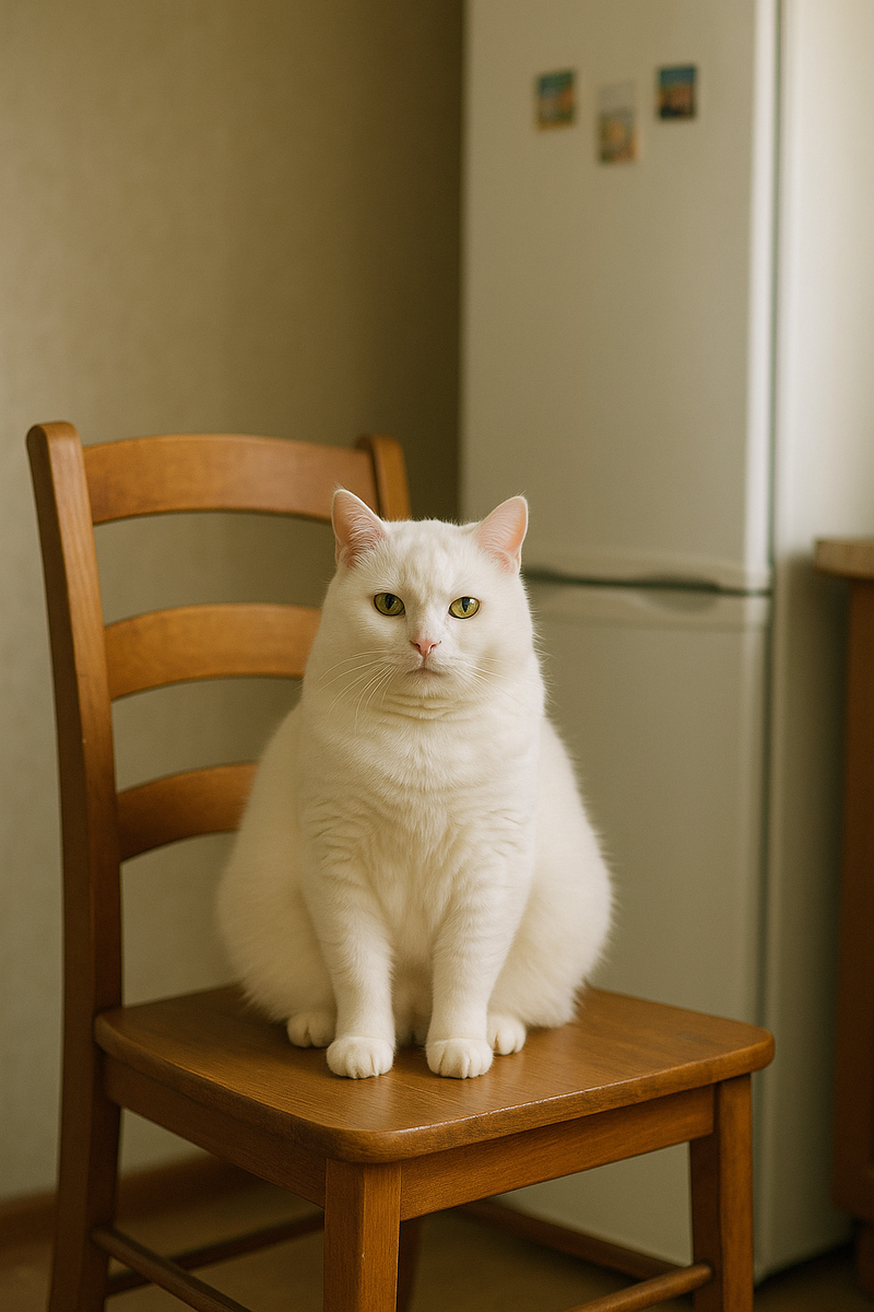 — Каждое утро. Всегда на этом стуле. Как будто ждёт. Мы думали — еду. А потом поняли: он просто живёт как философ. И в голове у него явно — не холодильник. 📸 На фото — белоснежный кот сидит на деревянном стуле на фоне кухни. Глядит строго, спокойно, как глава совета. Лапки сложены идеально, усы прямые, взгляд безмятежный. Это не просто кот — это тот, кто держит кухню в равновесии. И не даст ссориться на кухне без повода. 🎨 На картине: