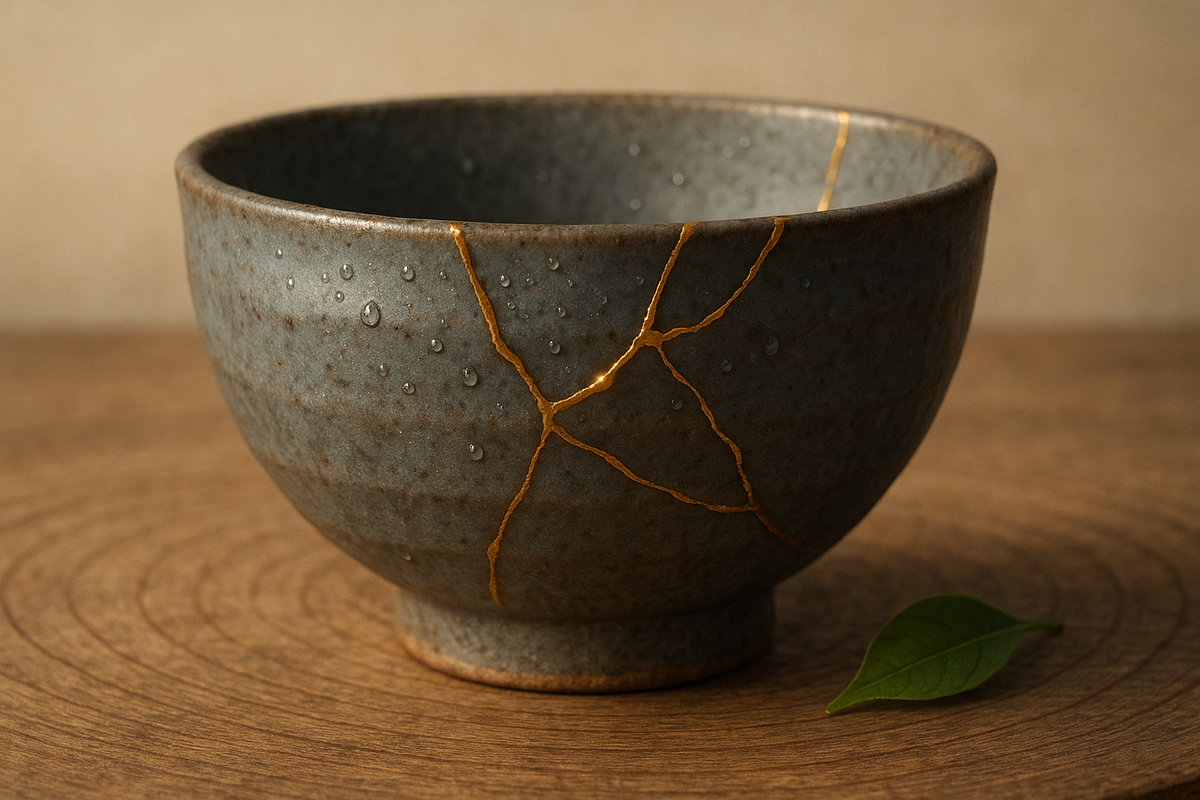 В известной японской практике кинцуги (金継ぎ) разбитую керамику восстанавливают, скрепляя осколки золотым лаком. Трещины не скрывают, а подчёркивают, превращая место поломки в самую выразительную часть предмета.