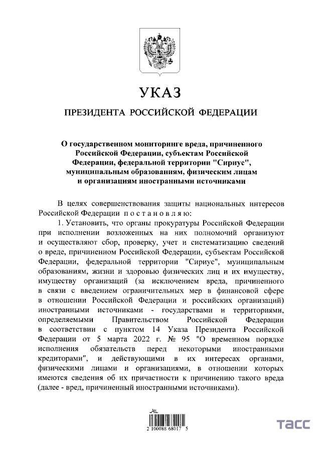 Путин подписал указ о проведении государственного мониторинга вреда, причиняемого России иностранными государствами и организациями.
