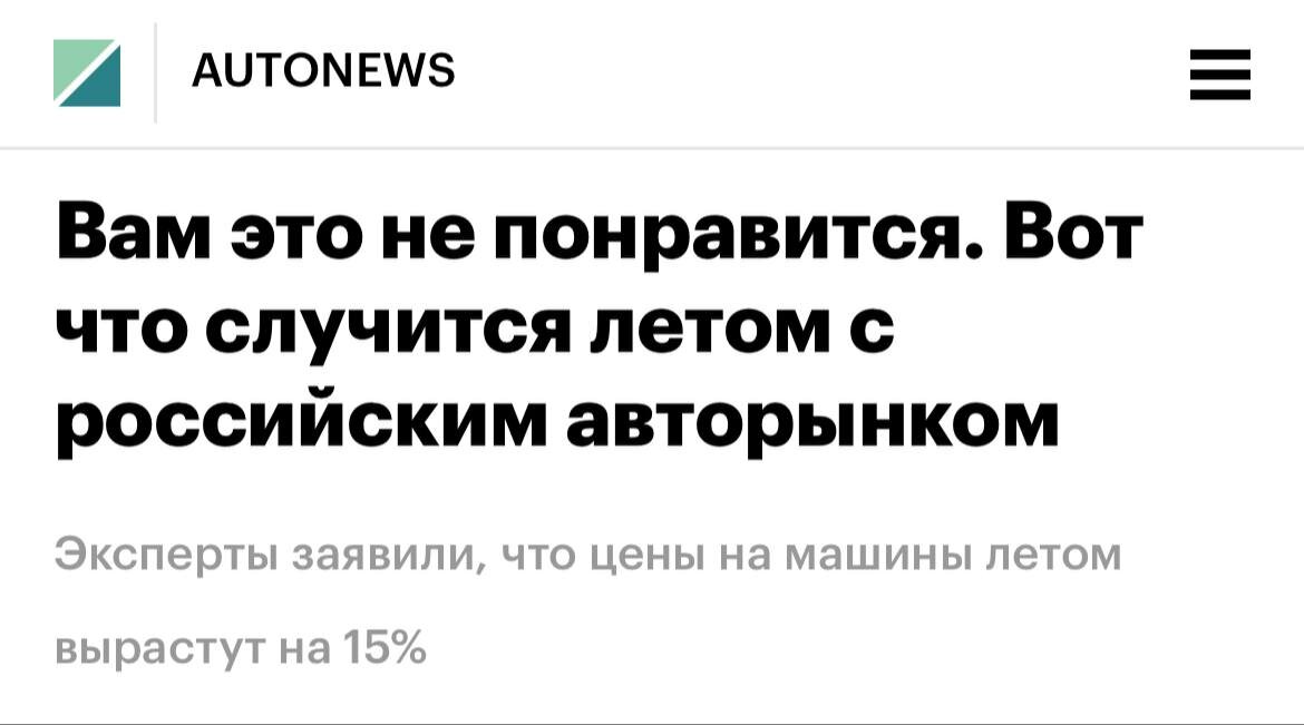 Летом автомобили в России подорожают на 15% — эксперты ожидают взлет цен на машины после весны. По их словам, к этому времени у дилеров закончатся запасы иномарок, закупленных по старым ценам и выставленных со скидками. На новые партии тачек спецпредложений можно не ждать. Следом ожидается подорожание отечественных авто на 7-9%. Если планировали обновляться — пора.