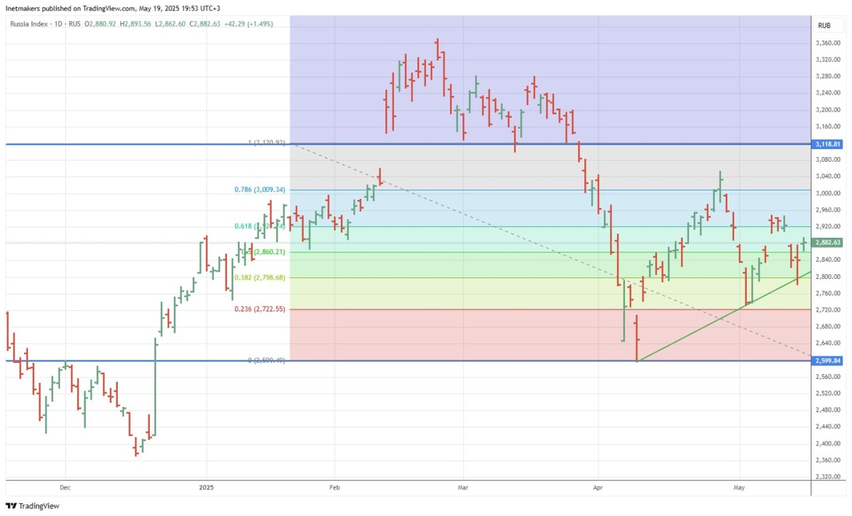 ❗️19 мая российский фондовый рынок вырос, индекс МосБиржи укрепился на 1,49% до уровня 2882,63. Сегодня рынок жил ожиданиями итогов телефонных переговоров Путина и Трампа, информация об итогах только поступает, рынок хотя и реагирует нервно, но сохраняет положительный результат дня. Пока, во всяком случае. 👉 Наш российский 🇷🇺 портфель — индекс FTinvest.ru прибавил 1,12% и достиг уровня 806,4647, зарабатывайте вместе нашим индексом FTinvest.ru с услугой автоследования. Курс доллара США по данным ЦБ РФ сегодня снизился на 0,44% и составил 80,4137 руб. Нефть WTI выше на 0,52% до $62,29 за баррель, а Brent на 0,43% и стоит $65,69. Золото сегодня выше на 1,53% и стоит $3235,96 за тройскую унцию. Биткойн снижается на 0,54% до $104930,00. Индекс S&P 500 ниже на 0,11%, Dow выше на 0,17%, а NASDAQ ниже на 0,31%. 👉 Наш американский 🇺🇸 портфель – индекс FTinvest 11 в настоящее время растет на 0,28%, следуйте за нашим индексом FTinvest 11 в закрытом телеграмм-канале, для этого подпиш