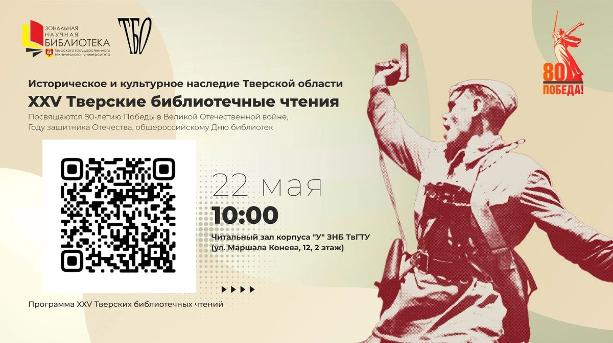 📚 22 мая 2025 года на базе Тверского государственного технического университета пройдут XXV Тверские библиотечные чтения «Историческое и культурное наследие Тверской области». Организаторами выступают Тверское библиотечное общество, Тверская областная библиотека им. А.М. Горького, Зональная научная библиотека ТвГТУ. Коллективное краеведческое мероприятие проводится на базе ТвГТУ в канун празднования Общероссийского Дня библиотек с 1999 года. С сообщениями на юбилейных библиотечных чтениях выступят представители библиотек Твери и Тверской области, темы докладов посвящены 80-летию Победы в Великой Отечественной войне, Году защитника Отечества и Общероссийскому Дню библиотек. 📎 С программой мероприятия можно ознакомиться в прикрепленном файле или по QR-коду. 🖥 В день проведения мероприятия будет вестись онлайн-трансляция.