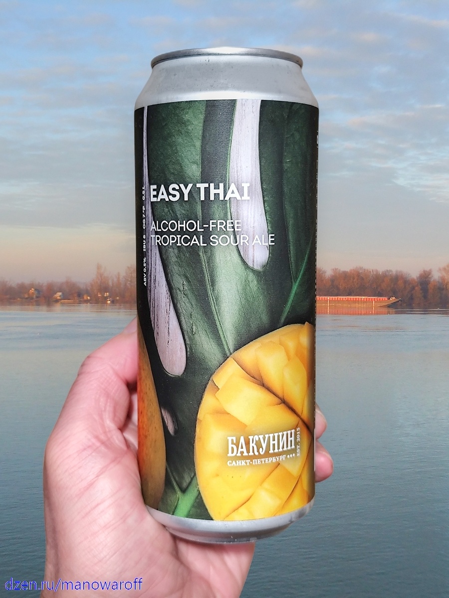 К тому же безалкогольный, ибо у нас сегодня ваш любимый ЗОЖный понедельник. Пробовать будем EASY THAI от пивоварни Bakunin Brewing Co. Как оказалось, появилась эта безалкашка достаточно давно - в мае 2021 года. Но как-то она умудрилась не попасться мне на глаза до недавнего времени. Глянем, что пишут пивовары о своем напитке: Чтобы вам было легче прощаться с летом, наш Easy Thai sour сделали еще проще - теперь он безалкогольный. Мы плавно выходим из отпуска, но не перестаем наслаждаться оттенками летних каникул, а именно ароматом спелых и очень сочных манго и маракуйи, от которых веет теплом тропического солнца и сладкими воспоминаниями. Э, стопэ! Какой-такой "прощаться с летом"? Я с ним только поздоровался! Как вы поняли, в составе присутствует мой "любимый" дуэт манго с маракуйей. В виде пюре. Так же в виде пюре там находятся ананас с лаймом. Ну и никак было не обойтись без консерванта в виде сорбата калия. Безалкашку я попробовал, когда ей стукнуло ровно шесть месяцев из отведенных