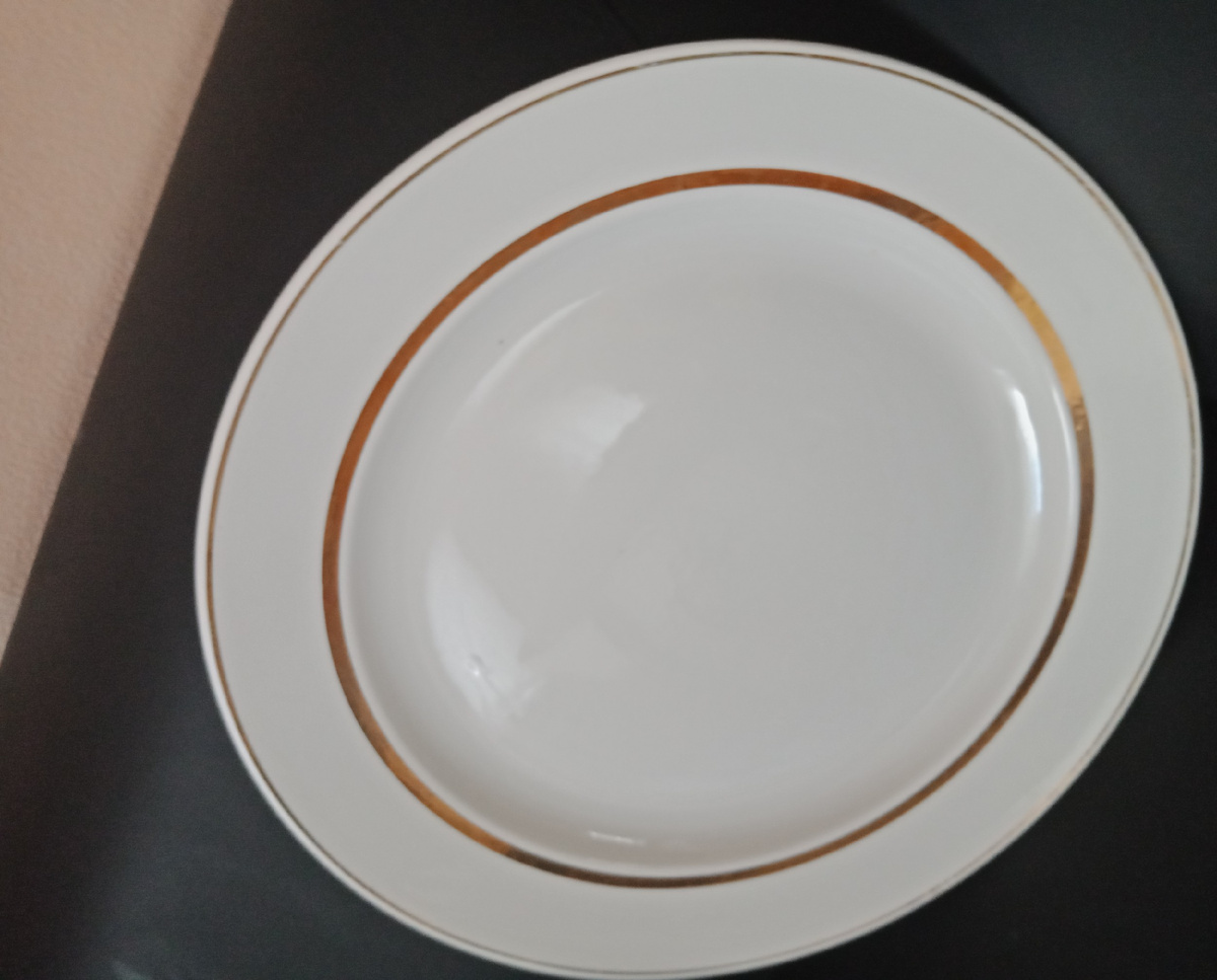 Многие собирают только молочники, отдельные чайные пары, чайники из разных серий, в общем, то, к чему душа лежит. Сегодня, хочу устроить флешмоб посуды, только с золотой каемочкой из советского периода. Ура!!! И начнем по старшинству или как получится…. 1. Легендарное «Конаково», ЗИК фабрика им. Калинина Блюдо из Конаково конец шестидесятых годов, с золотым ободком, блюдо праздничное. Служит для праздников, подаем в нем ароматный плов гостям или что – то другое. 2. Тарелочка с золотой каемочкой и буквами «МТ» (печатные), я предполагаю, что Министерство торговли. Производство знаменитого Дулевского фарфорового завода, выпускавшего спец. посуду. Даже год выпуска есть - 1986, с клеймом «Сокола» и птица смотрит влево. 3. И еще, такая же парочка тарелочек с золотой каемочкой и буквами «МТ» (прописные), я предполагаю, что министерство торговли. Но производство уже другого фарфорового завода - «Пролетарий», выпускавшего спец. посуду для нужд министерства. 4. Тарелочка, тоже с золотой каемочк