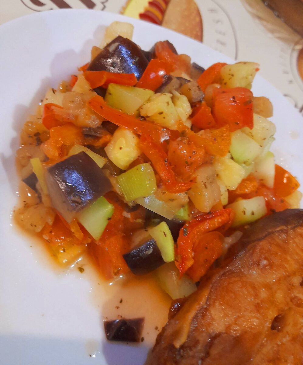 Наступает время овощей. А как же их вкусно приготовить? Есть рецептик интересного блюда. Некоторые называют его «Соте». Корни блюда французские. Принцип приготовления блюда в быстрой обжарке предварительно замаринованных овощей и подбрасывания из в сковороде. Мы не будем разбрасывать овощи по кухни, приготовим спокойно, без маринования и с удовольствием. В конце концов для не опытных поваришек это опасно. Баклажаны — 2 шт.; Кабачки — 2 шт.; Помидоры — 3 шт.; Болгарский перец — 2 шт.; Лимон — 2 кружочка; Масло оливковое или растительное; Приправы — прованские травы, черный перец молотый; Соль по вкусу. !!! Усилить вкус можно чесночком по желанию, но добавлять его за 3 минуты до завершения приготовления блюда. Нарезаем все овощи крупным кубиком. Прогреваем толстостенную сковороду с маслом. Обжариваем баклажаны на максимальном огне в течении 4-5 минут. Добавляем кабачки. Обжариваем ещё 5-7 минут. Теперь очередь болгарского перца и помидорчиков. !!!Я воду не буду добавлять, т. к. болгарск