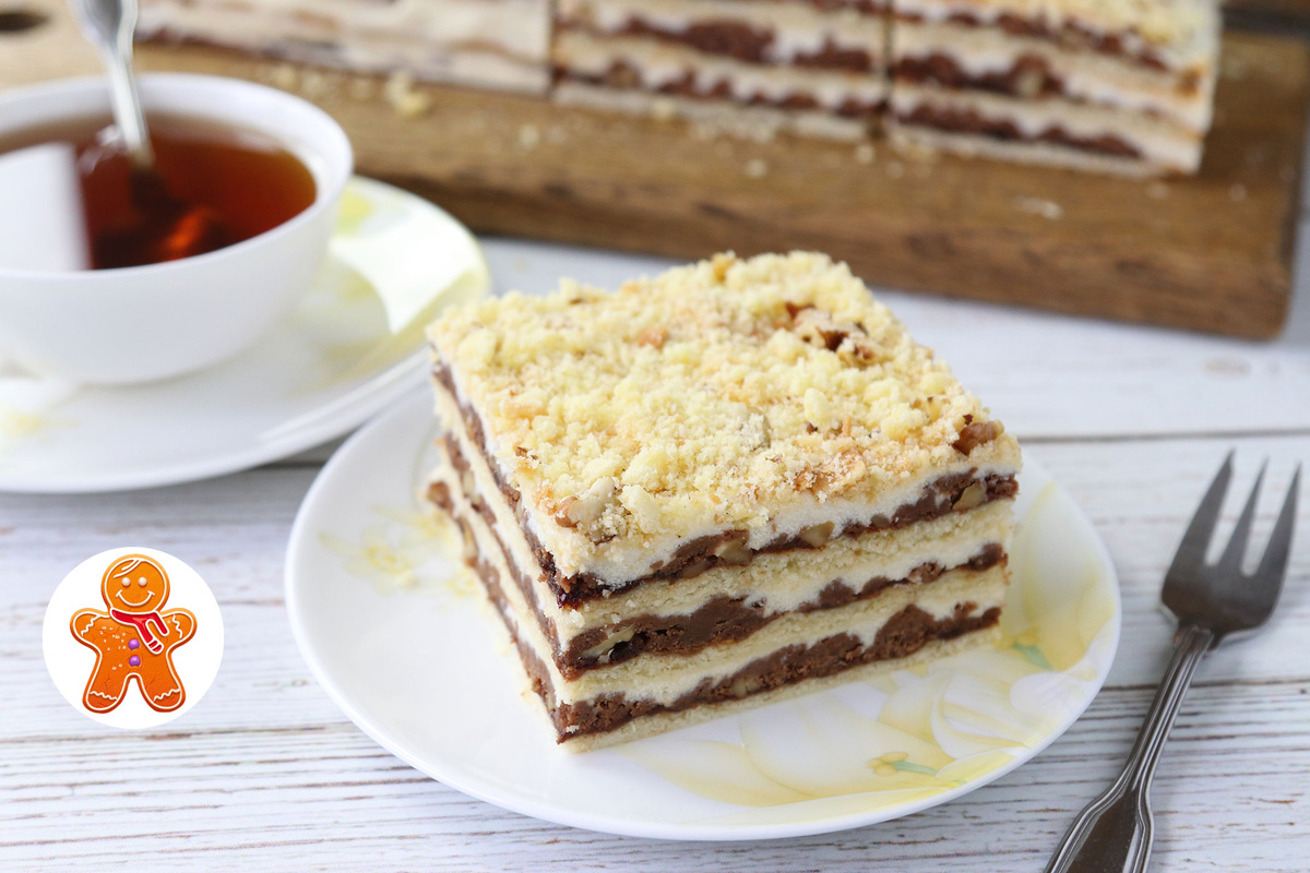 Печётся корж около 15 минут. Краешки нижнего коржа должны зарумяниться, верхняя крошка – пропечься.