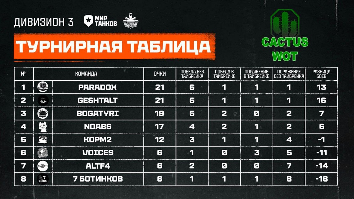 🏆 Команды третьего дивизиона ярко стартовали во втором круге Битвы Чемпионов — актуальная турнирная таблица в прикрепленном баннере. Результаты вчерашних встреч: ➖VOICES [1] : [4] NOABS ➖GESHTALT [4] : [0] ALTF4 ➖BOGATYRI [4] : [1] PARADOX ➖7 БОТИНКОВ [2] : [4] КОРМ2 ▶️ Записи матчей можно посмотреть на VK Видео Live, YouTube и Twitch каналах организатора. 🔜 Следующий игровой день состоится завтра. Команды второго дивизиона проведут свои первые матчи в рамках нового турнирного круга.