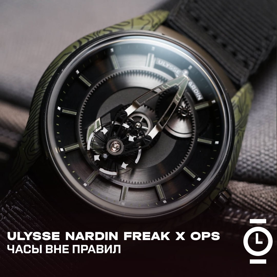 ULYSSE NARDIN FREAK X OPS: ЧАСЫ ВНЕ ПРАВИЛ #обзор_WD С момента появления оригинальной модели Freak компания Ulysse Nardin использует эту линейку для экспериментов с отображением времени и инновационными материалами. Freak X стала более доступной версией — с традиционной заводной головкой и упрощённой конструкцией. Как и другие Freak, эти часы почти полностью стирают границу между циферблатом, стрелками и механизмом. Время показывают элементы самого механизма: минутная стрелка соединена с орбитальным турбийоном, часовая — выступает из центра конструкции. Всё это вращается, указывая время. Зелёные метки с люминесцентным покрытием не слишком яркие, а турбийон может частично заслонять стрелки, что затрудняет считывание времени. Это скорее арт-объект, чем инструмент. Механизм — автоматический калибр UN-230, состоящий из 405 деталей, с запасом хода 72 часа. Частота — 21 600 полуколебаний в час. Механизм виден как спереди, так и через сапфировую заднюю крышку. Оснащён кремниевым спуском.