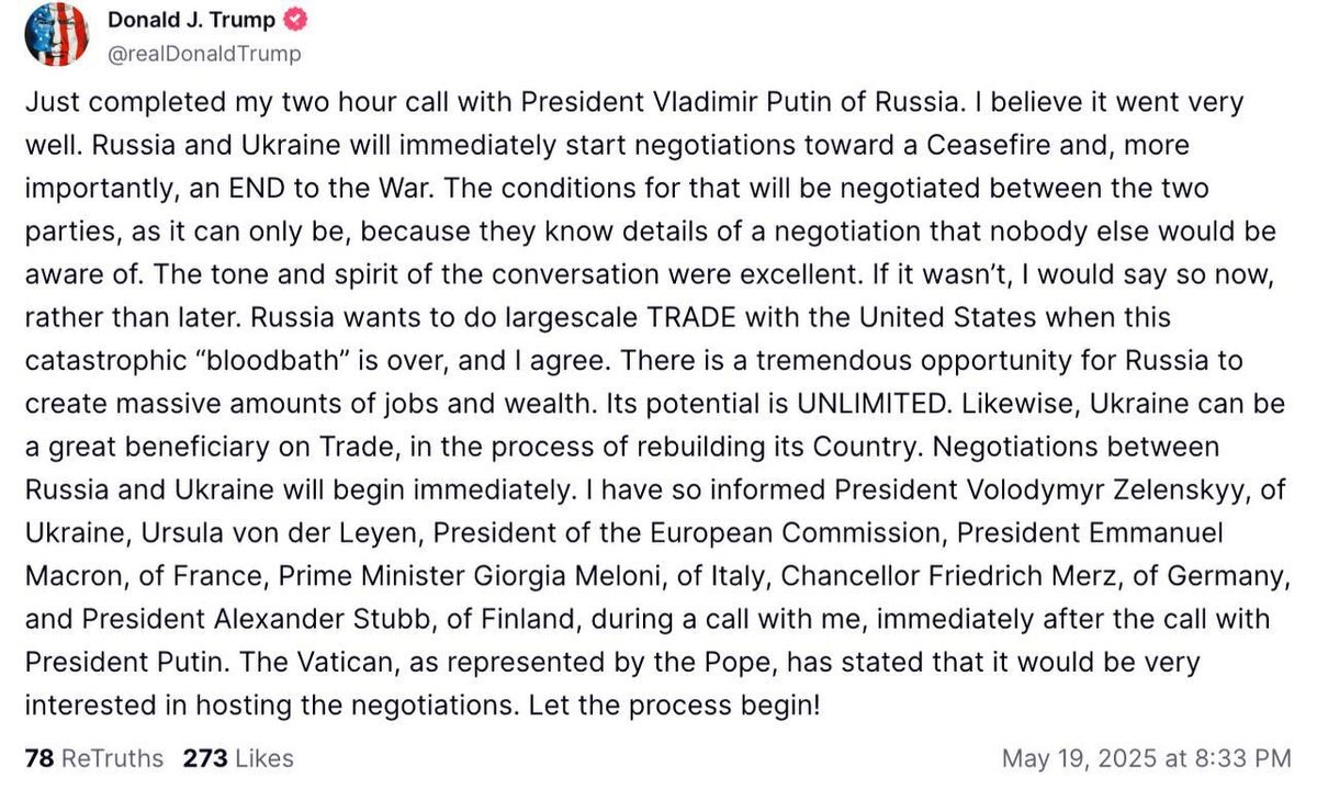 Russia-Ukraine to ‘IMMEDIATELY’ begin talks towards ceasefire — Trump after Putin call