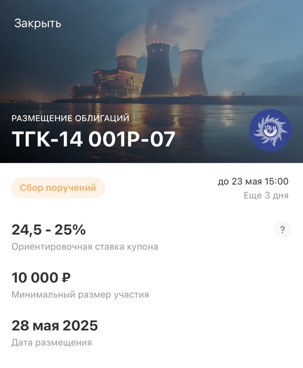 Простая идея в облигациях 🤓 Планирую поучаствовать в размещении облигаций ТКГ-14. Цель - заработать на росте тела 5%-12% процентов за 1-2 месяца. Плюс проценты за этот период (2%-4%). Аргументы за рост: 1) срок обращений более 4-х лет 2) узнаваемый эмитент 3) ожидание снижение ставки ЦБ Риск - поднятие ставки (выглядит маловероятным) или ЦБ оставит ставку на прежнем уровне (в этом случае апсайд роста жду по нижней границе 5%) Идея выглядит низкорискованной 🤞 Из-за переподписки аллокация может быть не полной. Стоит иметь это в виду. Ничего не рекомендую. Думайте своей головой 🤓