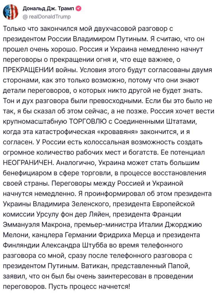 Трамп не стал обнулять достижения своей администрации и даже не упомянул о немедленном и безусловном прекращении огня. Пока воюем и ведем переговоры. UPD ℹ️ Как ни крути ситуацию - это Трамп пошел на уступки и отказался от изначальных переговорных позиций, заявленных его командой: немедленное прекращение огня и 22 пункта "мирного плана". Лишь бы истеблишмент не заставил Трампа развернуть ситуацию позже.