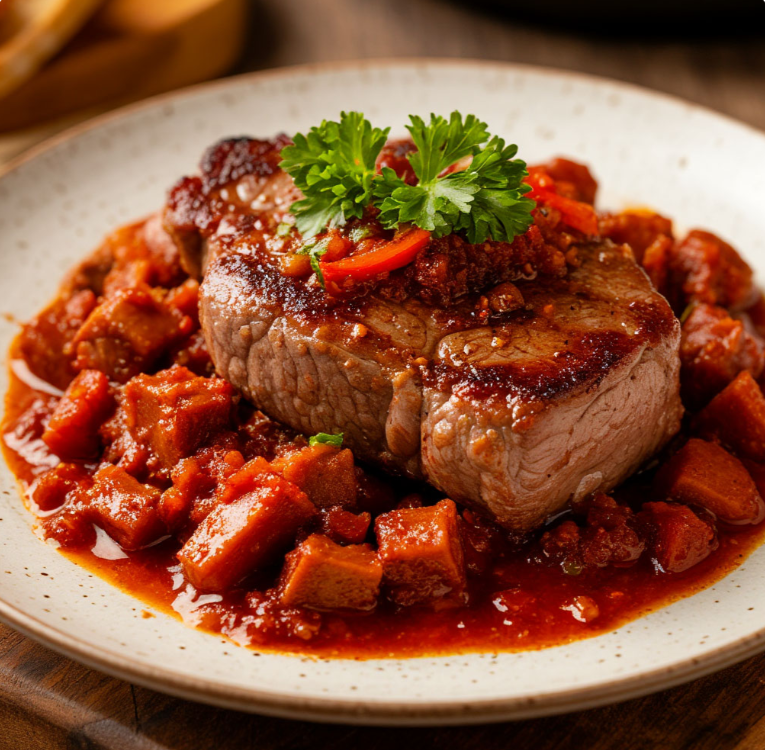 Приготовим пикантную буженину из свинины – ароматное и сочное блюдо, которое украсит любой стол! Нам потребуется: 1 килограмм свинины для запекания. А для маринада: 1 литр воды, 4-5 зубчиков чеснока, 2 лавровых листа, 2 столовые ложки соли, 1 чайная ложка черного перца горошком, 1 чайная ложка душистого перца, 1 чайная ложка орегано и 1 чайная ложка базилика. И для соуса для запекания: 1 столовая ложка кетчупа (или томатного соуса), 1 столовая ложка оливкового масла, 1 столовая ложка вустерского соуса и 1 чайная ложка паприки. Начнем с маринада. В кастрюле смешиваем воду, соль, лавровый лист, черный перец горошком, душистый перец, орегано и базилик. Доводим до кипения и остужаем. Чеснок очищаем и нарезаем пластинами. В куске свинины делаем надрезы и нашпиговываем чесноком. Заливаем свинину остывшим маринадом. Убираем в холодильник на 12-24 часа. Для соуса для запекания смешиваем кетчуп, оливковое масло, вустерский соус и паприку. Достаем свинину из маринада и обсушиваем бумажным полоте
