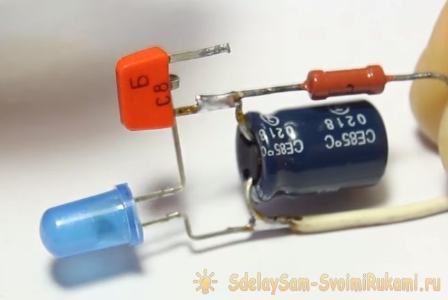 Бывает сильная надобность заставить светодиод мигать, для усиления привлечения внимания человека к сигналу. Но делать сложную схему просто нет времени и места для размещения радиоэлементов. Я покажу вам схему, состоящую всего из трех, которая заставит светодиод моргать. Схема хорошо работает от 12 вольт, что должно заинтересовать автомобилистов. Если брать полный диапазон питающего напряжение, то он лежит в пределах 9-20 вольт. Так что применений данное устройство может найти массу. Это по истине супер простая схема, чтобы обеспечить мигание светодиода. Конечно в схеме присутствует большой электролитический конденсатор, который может украсть много места, но это проблему можно просто решить воспользовавшись современной элементной базой, типа SMD конденсатором. Обратите внимание, что база транзистора висит в воздухе. Это не ошибка, а конструкция схемы. База не используется, так как в работе используется обратная проводимость транзистора. Такую мигалку можно собрать навесным монтажом мину