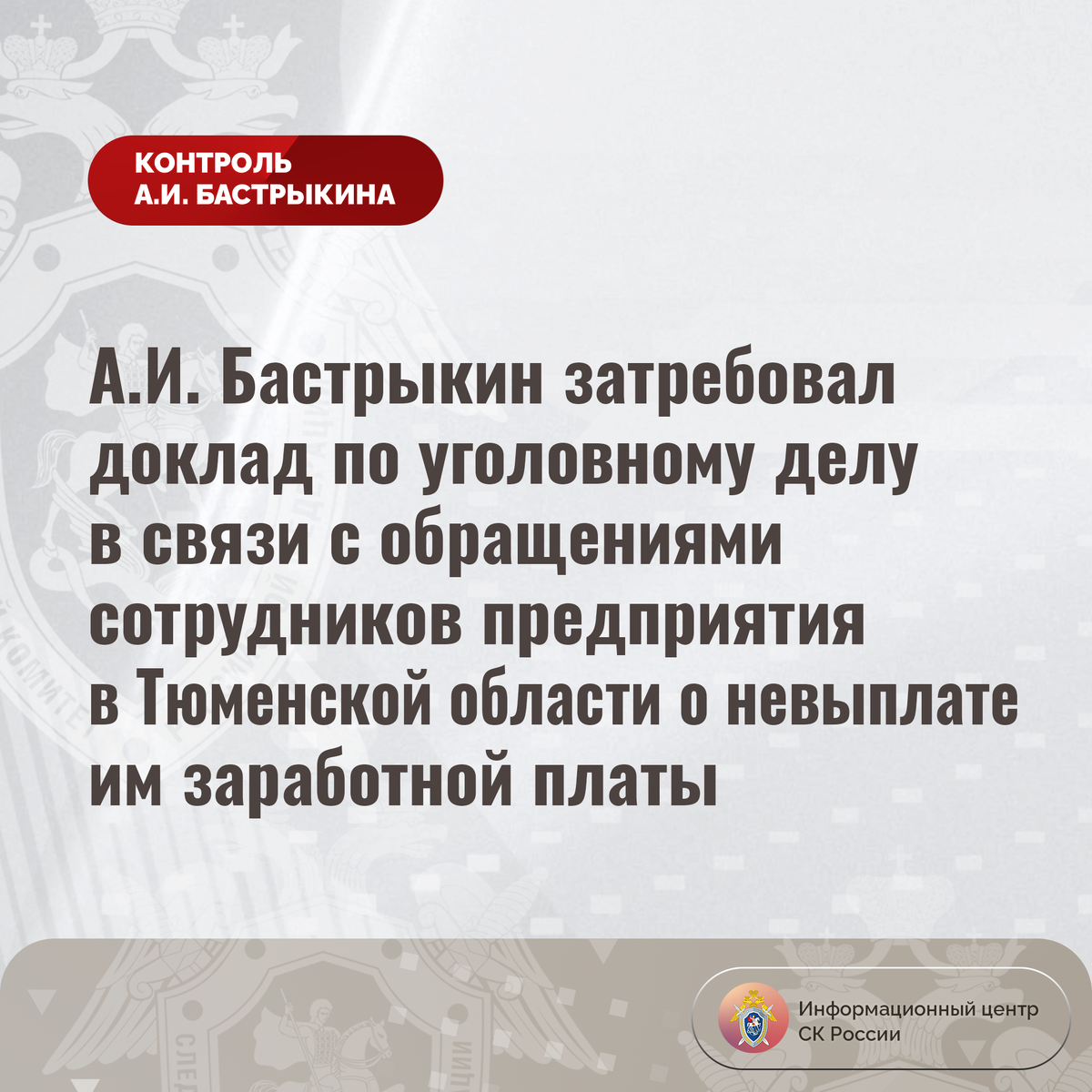 А.И. Бастрыкин затребовал доклад по уголовному делу в связи с обращениями сотрудников предприятия в Тюменской области о невыплате им заработной платы В Информационный центр СК России поступили обращения от сотрудников одного из предприятий Тюменской области. Заявители на протяжении длительного времени осуществляли трудовую деятельность в компании в различных должностях, однако заработная плата с января текущего года им не выплачивалась. Кроме того, окончательный расчет с сотрудниками, принявшими решение о расторжении трудовых договоров, не произведен. Многочисленные обращения к работодателю результатов не принесли, мер к погашению образовавшейся задолженности не принято. Ранее указанная ситуация освещалась в СМИ. А.И. Бастрыкин поручал представить по ней доклад. В СУ СК России по Тюменской области по данному факту возбуждено уголовное дело. Председатель Следственного комитета Российской Федерации Александр Иванович Бастрыкин затребовал у руководителя СУ СК России по Тюменской области А