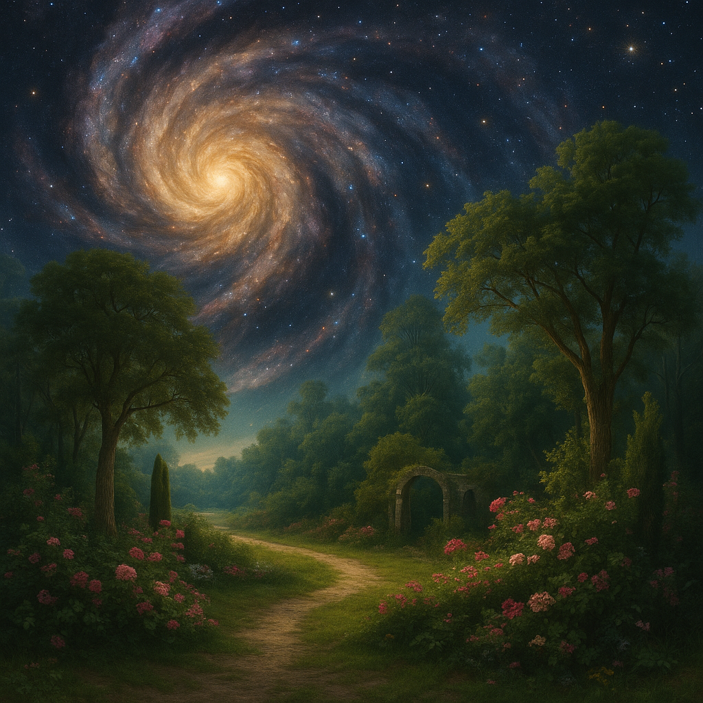Каждое мгновение расширялось, растягиваясь в бесконечный вздох: зияющие галактические туннели тянулись вперед, словно бесшумные реки света, уносящие в глубины тайн бытия. Его сознание растворялось в этих потоках, становясь частью живой ткани мироздания — ощущение растворения было подобно опьянению, когда капля росы смешивается с безбрежным морем.