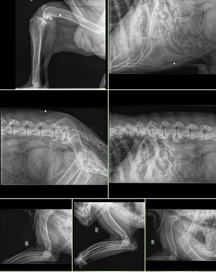 Если кто не знает его историю, читайте Пишу это для тех, кто не пользуется телеграмм, не переходил, по данной мною, ссылке. Это обследование, проведенное в клинике, уже под наблюдением Группы помощи алабаям, г.Чехов. Ребята молодцы, герои, что взяли такого больного пса и боролись за него до конца! День 1-й. По возрасту врачи определили, что, конечно Барсу не 4 и не 5 лет. Он очень пожилой, а его тело на рентгене показало дроби в мягких тканях. Когда-то в него стреляли. Но это не самое страшное, с этим живут, а пули так и сидят в мягких тканях. Анализы на инфекции пришли чистые, пироплазмоз не подтвердился. С кровью в моче и зловонным запахом разбирается нефролог. Также, Барс получает сильнодействующие наркотические анальгетики для купирования болевого синдрома. Пока Барс продолжает находиться в отделении интенсивной терапии, о выписке пока речи не идет. День 2-й. Консультация невролога вчера показала наличие спондилеза на всех участках позвоночника, более выражено в крестцово- поясни