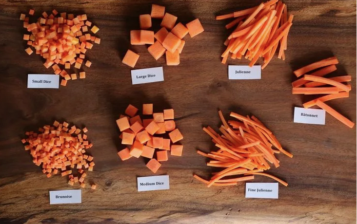 Итак, задаемся вопросом: что будет дальше с ферментированными овощами? Будут ли они частью супа, салата или будут выложены на тарелку. Как будут сервированы... Рассмотрим, как выглядят техники нарезки, способные кардинально изменить вид и текстуру закусок. Брюнуаз (Brunoise) французский кулинарный термин, означающий нарезку овощей на мелкие кубики точного и одинакового размера: очень мелкие кубики (1–3 мм) Техника: нарезаем овощ пластинами, затем полосками, затем - кубиками. Таким образом нарезаем морковь, лук, лук-порей, сельдерей, болгарский перец и твердые корнеплоды, такие как свекла и репа. Мелкий брюнуаз/сизле (Fine brunoise/ciselé): мельче брюнуаза. Македуан (Macedoine): средние кубики (5–7 мм) Парментье: крупные кубики (около 1,5 см) Карре: очень крупн