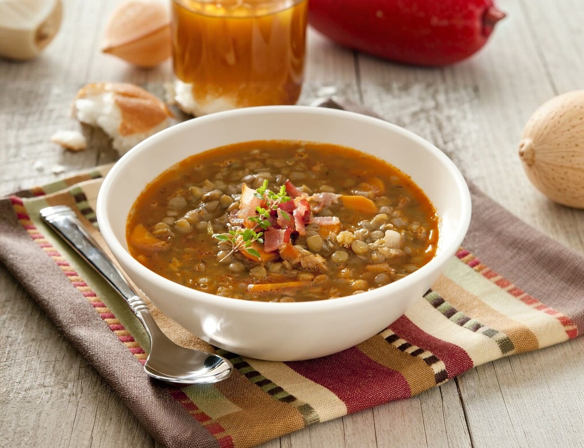 Вот простой и вкусный рецепт супа из чечевицы: