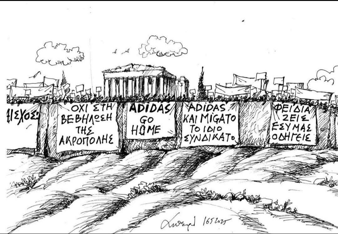Карикатурист Андреас Петрулакис о кампании с СМИ в связи с тем, что в кадры дрон-шоу попал Акрополь: «Нет осквернению Акрополя!, «Адидас гоу хоум», «Адидас и Мигато одна клика», «Фидий, живи, ты нас ведешь»
