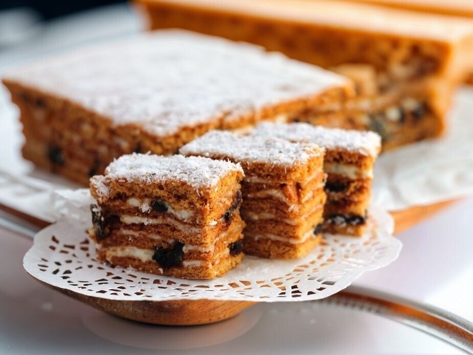 Нежный, ароматный торт с медовыми коржами и кремом на основе сметаны с добавлением чернослива.