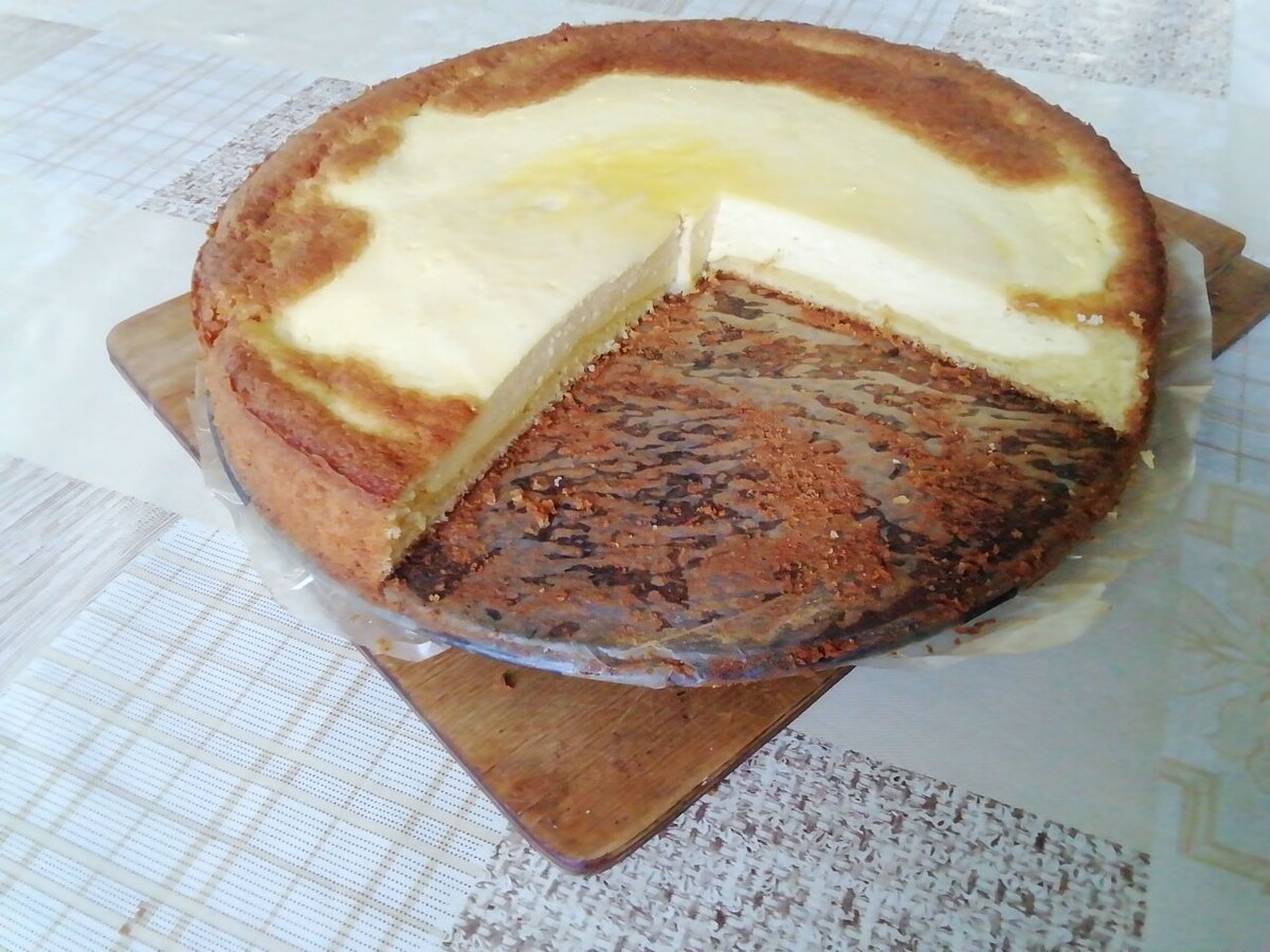 Тесто: Сахар-100гр 2 яйца 2ст.л раст. масла 2ст.л слив. масла 1ст. (200гр) сметаны 130гр муки 0,5ч.л соды погасить уксусом Начинка 100гр сахара 500гр творога 3 яйца 1ст.л крахмала Ваниль В форму положить тесто, а начинку по центру с верху. Выпекать 30 мин, при температуре 180 градусов