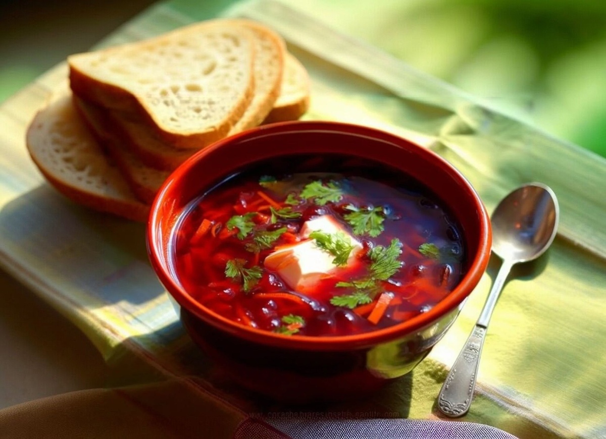 Плотный, наваристый борщ с говядиной, свеклой и характерной для московского варианта добавкой – ветчиной или докторской колбасой.