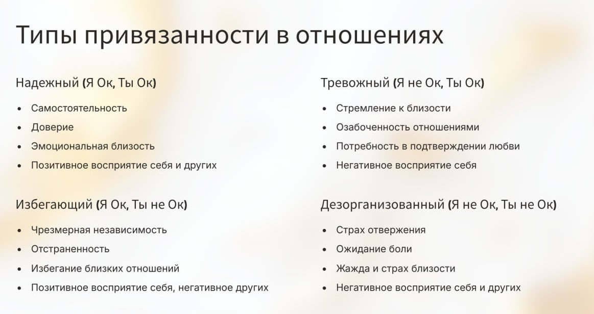 Недавно прослушала полезный для себя вебинар Надежды Матушкиной «Как стиль привязанности клиента влияет на терапевтический процесс». Это заставило задуматься о том, как наши ранние отношения с близкими формируют всю нашу жизнь. Что такое травма привязанности? Это эмоциональная рана, возникающая из-за ненадежных, травмирующих или отсутствующих отношений со значимыми взрослыми. Она влияет на то, как мы строим отношения во взрослой жизни, как справляемся со стрессом и даже как выбираем профессию. Почему это важно? Стиль привязанности (надежный, тревожный, избегающий, дезорганизованный) определяет нашу способность доверять, любить и чувствовать себя в безопасности. Как вы думаете, как ваш детский опыт повлиял на ваши взрослые отношения? Проверьте на практике, какой у вас стиль (тип) привязанности? Как вы обычно реагируете, когда партнёр не отвечает на сообщение? 1. ТРЕВОЖНЫЙ СТИЛЬ. Я волнуюсь, набираю его ещё и еще, проверяю когда он был онлайн. 2. ИЗБЕГАЮЩИЙ СТИЛЬ. Я нагружаю себя делами,