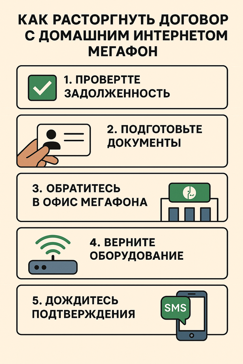 Если вы больше не планируете пользоваться услугами домашнего интернета от Мегафон, необходимо официально расторгнуть договор. Ниже — пошаговая инструкция, которая поможет сделать это быстро и без лишних сложностей. Перед расторжением договора важно убедиться, что на вашем лицевом счёте нет долгов. Проверить это можно: Для расторжения договора потребуются: Если договор оформлен не на вас, потребуется нотариально заверенная доверенность от владельца. Расторжение договора осуществляется только в офисах компании. Найти ближайший салон можно на карте: megafon.ru/map Перед визитом рекомендуется уточнить, обслуживает ли выбранный салон клиентов по домашнему интернету — такие функции есть не во всех офисах. На месте потребуется заполнить заявление на расторжение. Сотрудник компании поможет оформить всё правильно. Если при подключении вы брали в аренду роутер или другое оборудование, его необходимо вернуть. При сдаче выдают акт приёма-передачи — сохраняйте этот документ как подтверждение возвра