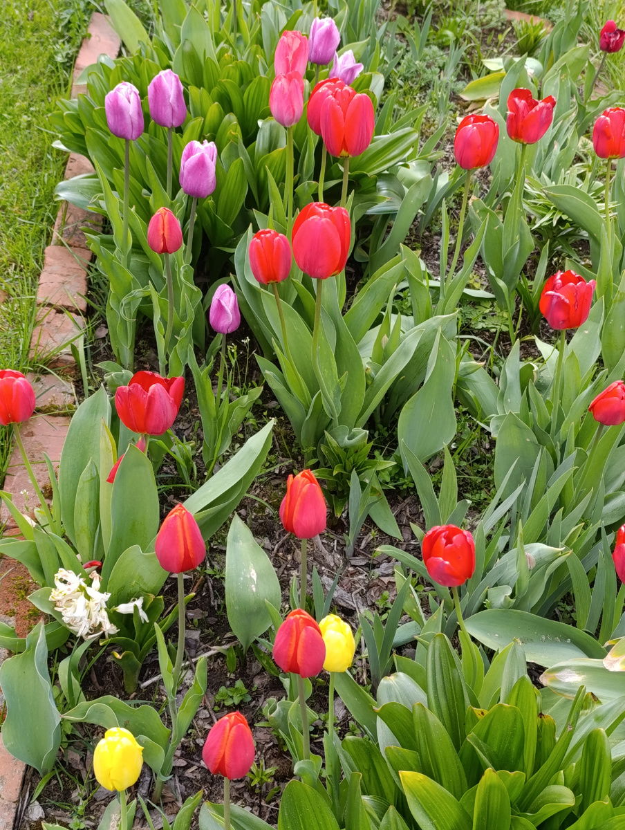 Добрый день всем! Авторы и читатели уже давно выкладывают фото своих тюльпанов, у многих они уже отцвели, а у меня каждый день новые раскрываются. Хотелось показать все вместе, но поздние не торопятся пока. Не смотря на сюрпризы погоды всё соответствует природному графику- первые тюльпаны расцвели к 9 мая, как и обычно. Это были самые обычные- красные, розовые, сиреневые, жёлтые, белые, бордовые. Их у меня очень много. Что-то покупала, что-то брала в добрые руки, а что-то с городских клумб, нет, не ворованных, а подобранных после освобождения для однолетников. У нас на работе очень много клумб, в начале июня приезжает служба и безжалостно всё вырывает, готовя место для летников, вот тут-то самое главное в этот день быть на работе 😅. Тюльпаны у меня везде! На клумбах, под деревьями, между кустами, даже в клубнике. После цветения их не выкапываю. Один нюанс- сортовые стараюсь сажать кучками, отдельно от простых. Но фавориты у меня-махровые. Пионовидные, плотно набитые шапки. Гляньте, к