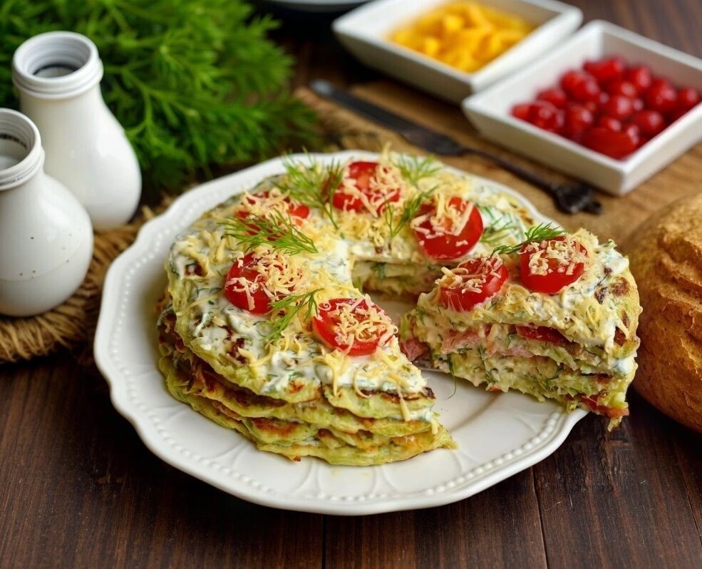 Необычный, но очень вкусный "торт" из кабачков с нежной начинкой – отличная альтернатива традиционным закускам и пирогам.