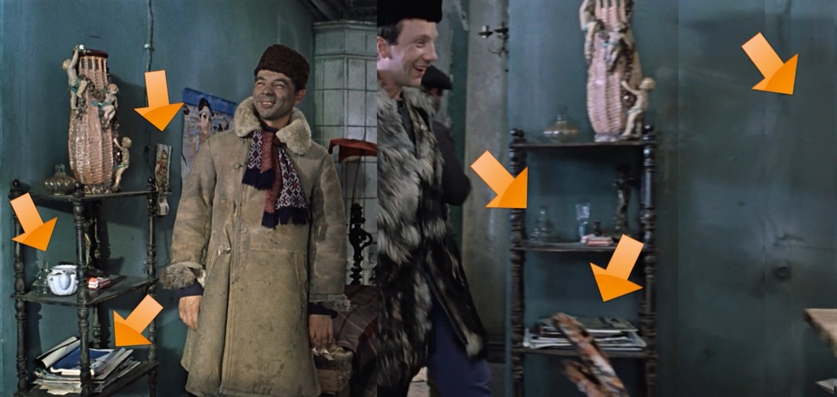 В первой части мы разобрали подоконники, платки и исчезающие кружки. Теперь — самое интересное! Готовы? Погнали! На стене висит плакат, на столе — чайник и книга. Они садятся за стол — и всё исчезает. Стул стоит торцом, а затем — уже боком к столу. Подъезжают чёрная и вишневая Волги, уезжают — две вишневые. Сначала — пустой, затем — полный. В этой же сцене жидкость сначала светлая и мутная, а потом напиток как и у всех. Алибаба спас из огня маленький свёрток — всё, что успел вытащить из горящего дома. Но уже в следующей сцене свёрток превращается в совершенно другую тряпку. Герои сами говорят, что дом сгорел, и вся одежда — вместе с ним. Но в электричке все снова в своей старой одежде, как будто ничего и не происходило! У Алибабы на голове сначала обычная шапка. Но стоит сцене потребовать "больше экшена" — и у него уже на голове шлем. Вот так, друзья — даже легендарное кино не обх