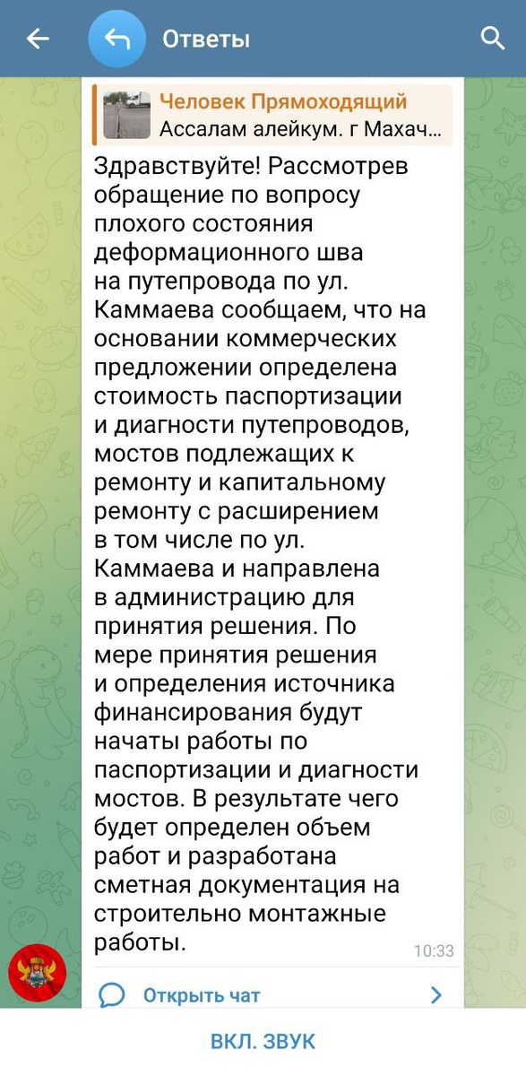 ©Ассалам алейкум, уважаемый "Черновик". Пришёл ответ, с тг-канала мэра Махачкалы, по поводу плачевного состояния путепровода (моста) по ул. Каммаева. Из ответа понял, что — будут деньги, будет ремонт." #нам_пишут Подписаться на "Черновик" 2.0 | Обратная связь: @chernovik_1_bot