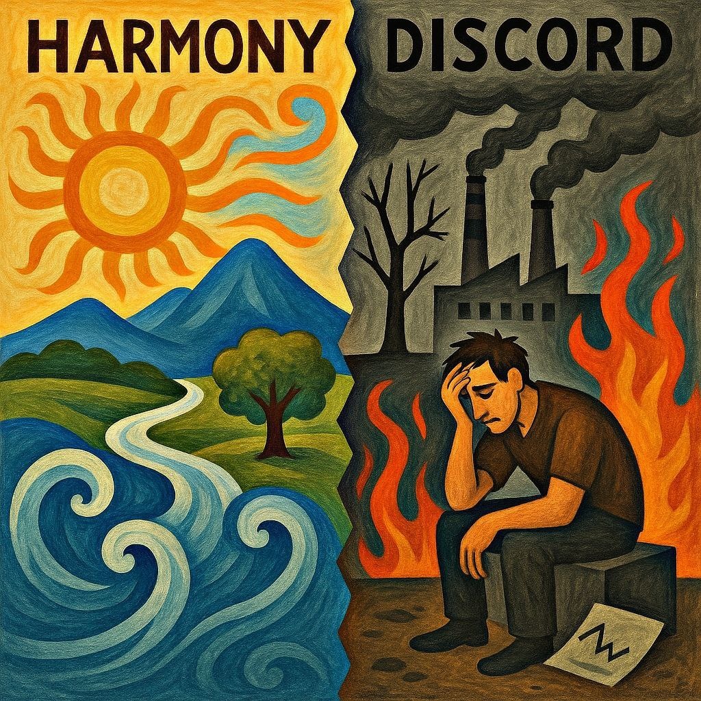 Нарушение гармонии происходит, когда человек выходит за пределы своей стихии. Именно он вызывает дисбаланс в природе, где его действия приводят к катаклизмам.Человечество — единственный элемент во Вселенной, который намеренно нарушает гармонию и злоупотребляет божественной энергией. Это единственная сфера, где люди заявляют о своей независимости от Бога, отрицая его активное присутствие в своей жизни.
