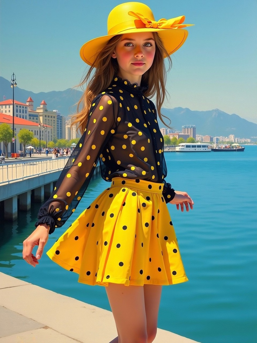 Девушка на берегу моря. Промпт: Яркий и динамичный портрет молодой девушки, стоящей на живописной набережной. На ней ярко-желтая широкополая шляпа, украшенная бантом, черная прозрачная шифоновая блузка в ярко-желтый горошек и яркая юбка ярко-желтого цвета в черный горошек. Ее длинные красивые ноги представлены в динамичной позе, вызывающей ощущение движения и энергии. Стиль картины напоминает работы Константина Разумова и Висенте Редондо, благодаря смелым мазкам и ярким цветам. Нейросеть: Leonardo. Preset: Flux. #нейросеть #красиваядевушка #брюнетка #цифровоефото #девушка #идеи #рисунок #цифроваяживопись #артыотнейросетей #aiwoman #берег #море #DigitalDreamscapes #нейроарт #нейрофото #digitalart #leonardo #aiartwork #иллюстрация #арт #DIY #flux #ai