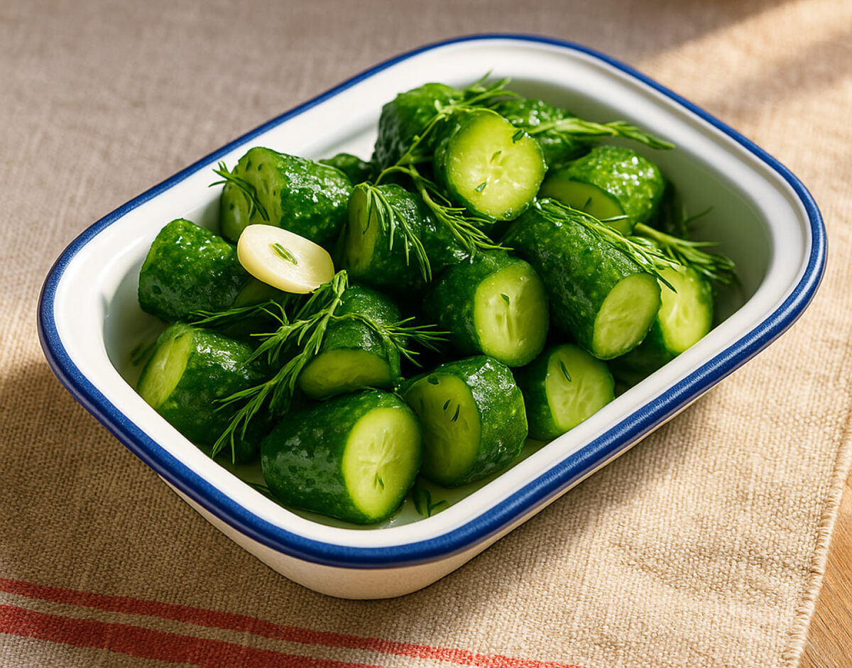 Укроп 50 г Чеснок 3 зубчика Черный перец горошком 5 штук Крупная соль по вкусу Огурцы 500 г Душистый перец горошком 3 штуки 1.Подготовить все ингредиенты. 2.У огурцов срезать кончики и нарезать сами огурцы толстыми бочонками. 3.Чеснок очистить и нарезать лепестками. 4.Душистый и черный перец слегка раздробить в ступке или молотком для мяса. 5.Пучком укропа сначала немного отхлестать поверхность стола или доски — это высвободит эфирные масла. 6.Затем порвать укроп руками на небольшие веточки. 7.В контейнер с плотно закрывающейся крышкой выложить огурцы, чеснок и укроп. 8.Добавить дробленые перцы и щедрую щепотку соли. 9.Закрыть контейнер крышкой и активно потрясти, чтобы все ингредиенты хорошо перемешались. Убрать в холодильник на 1–2 часа, трясти их каждые 15–20 минут. 10.Подавать малосольные огурцы в качестве закуски. Любите читать Дзен «Еды»? Расскажите свое мнение о материале в комментариях и ставьте свои лайки!