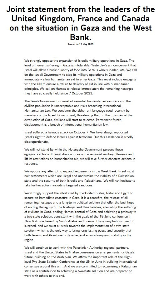 Carney, Macron and Starmer threaten sanctions on Bibi