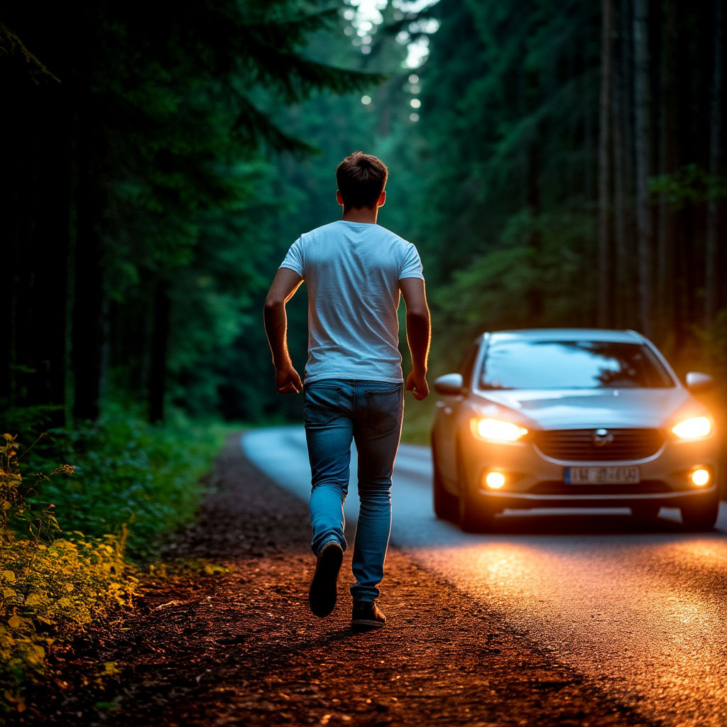 В этот момент на освещенную только фарами автомобиля дорогу выбегает мужчина. Он размахивает руками, что-то кричит и это пугает находящихся в машине женщин. Водитель останавливается, осыпая незнакомца многоэтажными матами, но открыть окно или выключить музыку, чтобы услышать, что говорят боится.