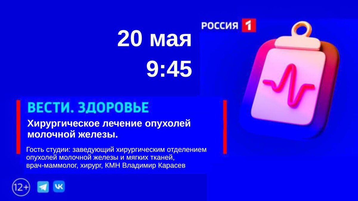 Рак груди встречается во всех возрастных группах. Каждая 8-я женщина имеет риск получить диагноз «рак молочной железы». Но если выявить его вовремя, то это практически единственный вид рака, который можно полностью победить. ❓ Какие методы используются в лечении, и как победить рак молочной железы? Заведующий хирургическим отделением опухолей молочной железы и мягких тканей, врач-маммолог, хирург, кандидат медицинских наук, Заслуженный врач России Владимир Карасев ответит на все вопросы. У вас есть вопросы? Задайте их в нашем Telegram: 8-903-927-00-07. Не пропустите программу "Вести Здоровье" 20 мая на телеканале "Россия 1" или подключайтесь к нашей трансляции по ссылке (https://vkvideo.ru/video-77090115_456260072).