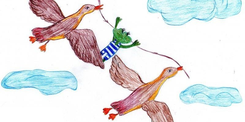 Жила-была обыкновенная лягушка. Однажды к ней в болото прилетели отдохнуть утки, которые отправлялись на юг. Лягушка попросилась с ними, но птицы отказались — ведь зеленая совсем не умеет летать. Тогда квакушка придумала хороший план — она будет держаться за прутик. И утки…