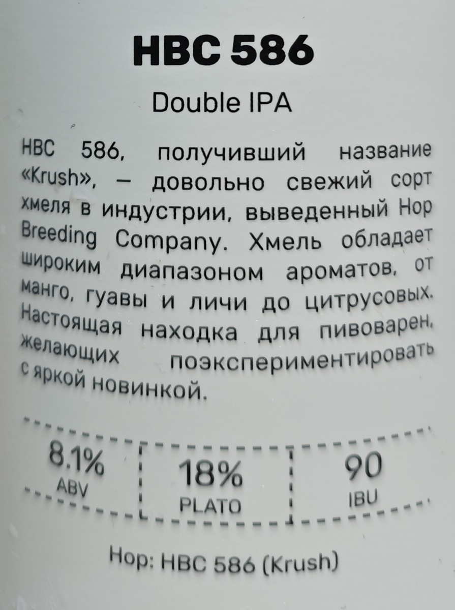 Двойной IPA на хмеле HBC 586 (Krush) от White Stone Brewery (ООО "Пивоварня Вайт Стоун"), сваренный под контролем на мощностях ООО "Боярин и Ко" в городе Лыткарино. По старой доброй традиции значение алкоголя на этикетке указано разное: 8.1% и 6.9%. На банках от Белых Камней подобные расхождения - не редкость. Но так как этот IPA всё таки двойной, то буду считать верным крепость 8.1%. Описание можно прочитать прямо на этикетке: ********************************************************************************** Плотность: 18%. Горечь: 90. Состав: вода подготовленная, солод пивоваренный ячменный, хмель, дрожжи пивные. Срок годности: 365 суток при температуре от 0℃ до +4℃. С даты розлива моей банки прошло почти 2.5 месяца. ********************************************************************************** Пена пышная и очень стойкая. В аромате манго, гуава и немного цитрусов; сильный и приятный. Карбонизация низкая. Глоток. Пиво ощущается на старте плотно и густо - из-за низкого карбо, но в